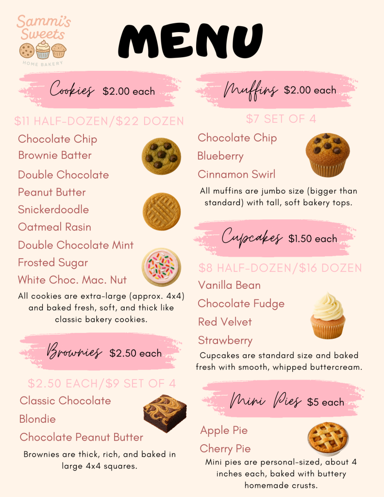 Sammi’s Sweets brings you small-batch cookies, muffins, cupcakes, and pies baked fresh each week. Preorder online, pick up at your convenience, and enjoy the taste of home without the hassle.